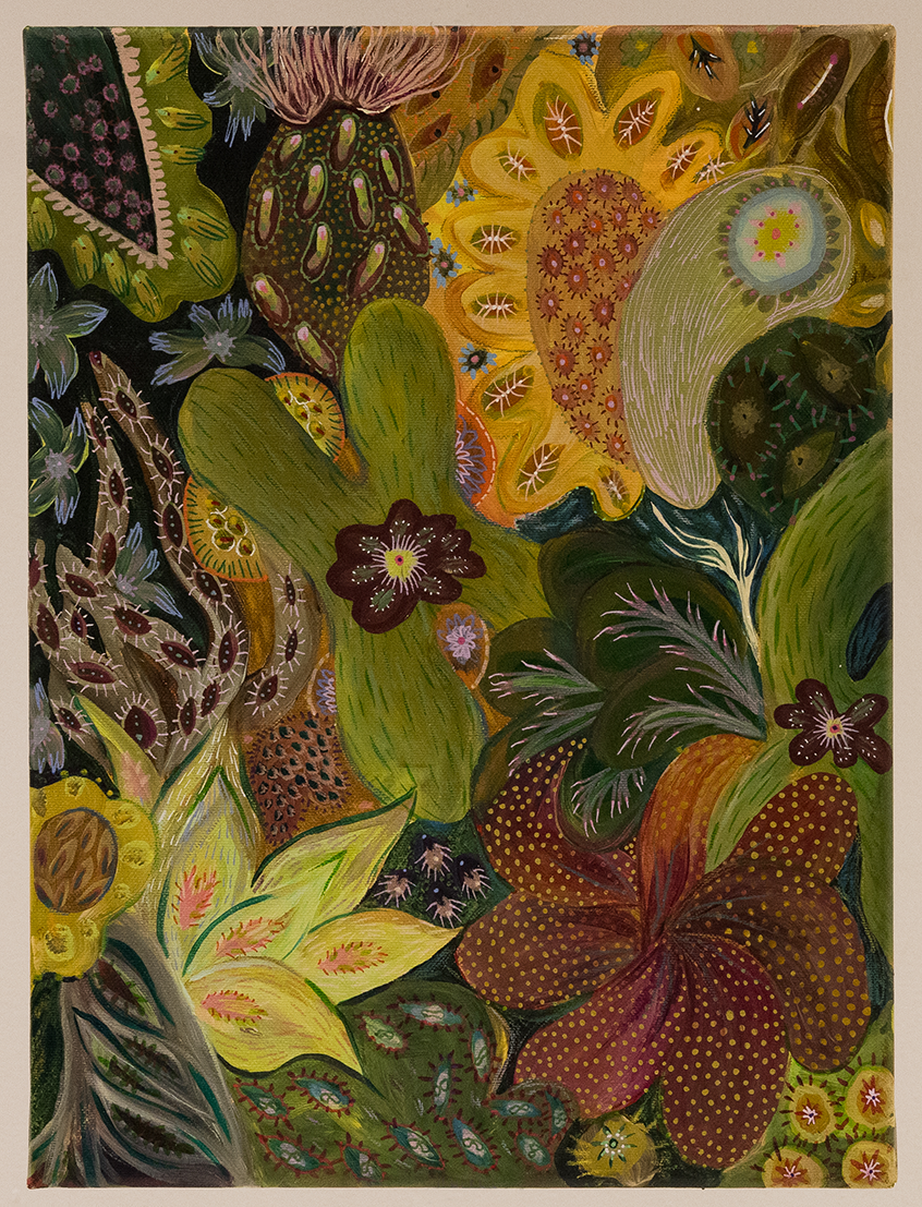 Material: Akrýl og vaxlitir á striga